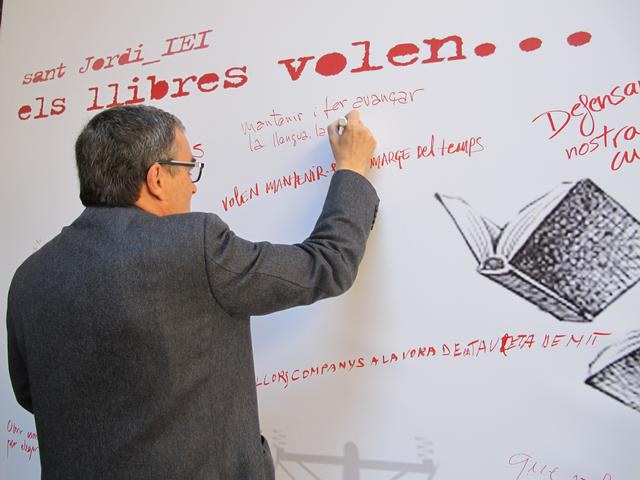 En acabar les intervencions, l’alcalde ha obsequiat els presents a l’acte amb un punt de llibre, elaborat per Shalom, que representa un dels gegants de la ciutat. Ros també ha deixat escrita la seva reflexió entorn a “Els llibres volen...” en el mur gegant que està instal·lat al patí de l’IEI amb motiu de la Diada, perquè qui vulgui faci la seva aportació.
