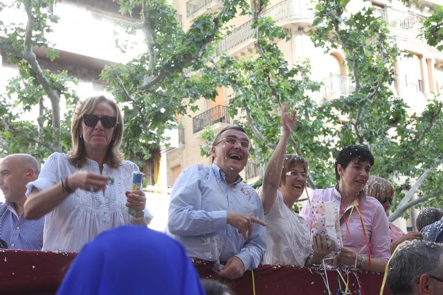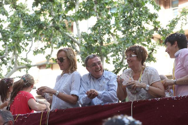 L’alcalde de Lleida, Àngel Ros, i els membres de la Corporació Municipal, han participat en aquest combat festiu, que com és habitual ha fet una primera volta de reconeixement i una volta i mitja més, obrint el foc al llançament dels paperets de color, fent el recorregut des de la plaça de Ramon Berenguer IV fins a Francesc Macià.