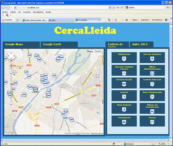 Les aplicacions per a cartografies Google premiades a la Lleida Magical Lan Party ja estan disponibles al web de l’Ajuntament de Lleida www.paeria.cat/opendata. Es tracta de “CercaLleida”, de Jordi Puig, una aplicació que permet ubicar, al Google Maps i al Google Earth, diversos serveis de la ciutat com allotjaments, bars i restaurants, serveis sanitaris, edificis administratius o centres esportius, entre altres. També ha estat premiada l’aplicació “Hoy Montadito”, d’Arnau Eroles, que recull l’oferta de tapes que es poden trobar als bars i restaurants de Lleida. Finalment, també s’ha reconegut l’aplicació “Travelling Salesman Problem”, de Miquel Vidal, que ofereix la millor ruta possible –menys distància- per arribar a un indret determinat.