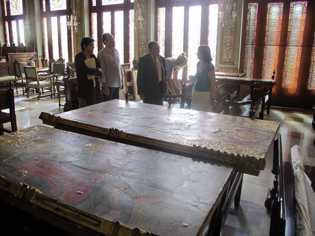 L’alcalde de Lleida, Àngel Ros, acompanyat de la tinenta d’alcalde, Marta Camps, i del director del Museu Jaume Morera, Jesús Navarro, ha visitat aquest matí les tasques de muntatge del Retaule de la Verge dels Paers a la Paeria, després que l’original hagi format part durant gairebé quatre mesos de l’exposició “Catalunya 1400. El gòtic internacional” que ha tingut lloc al Museu Nacional d’Art de Catalunya (MNAC).