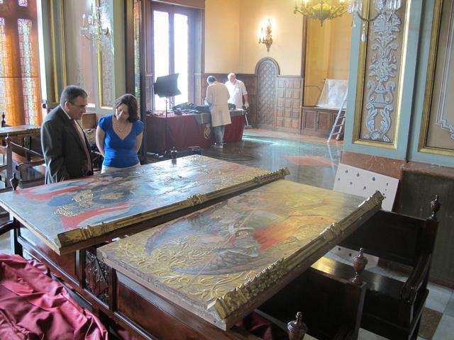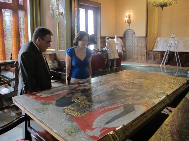 El paer en cap ha saludat l’equip els restauradors del Museu Nacional d’Art de Catalunya (MNAC) responsables de la instal•lació de l’original, i s’ha interessat pel procediment i tasques de muntatge, que s’allargaran durant tot el dia d’avui.