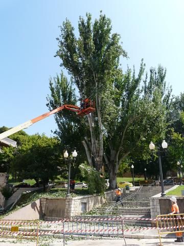 L'Ajuntament de Lleida plantarà nous arbres en l'accés a la Porta del Lleó de la Seu Vella durant la propera campanya de plantació que es durà a terme el proper hivern. Aquest matí s’ha iniciat la retirada d’un exemplar d’Àlber (Populus boleana) que presentava un risc elevat de caiguda ja que a principis de juliol es va esqueixar una branca de grans dimensions i va deixar al descobert un gran forat al centre del tronc. L’operació l'han dut a terme una desena d’operaris que, al llarg del matí, han treballat enretirant branques i ramificacions.