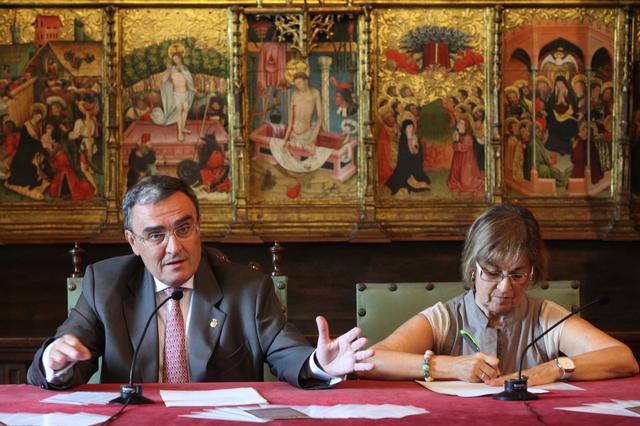 L’alcalde de Lleida, Àngel Ros, acompanyat de la tinenta d’alcalde Montse Parra, ha presentat avui els actes de la Diada 2012 al Palau de la Paeria.