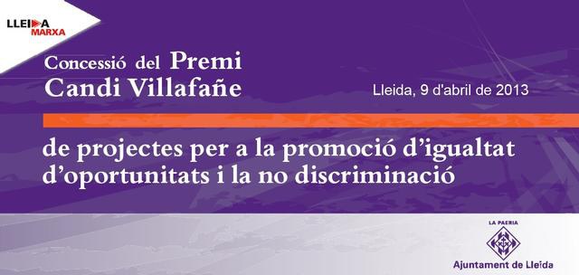 L'Ajuntament de Lleida lliura el proper dimarts, 9 d’abril, els guardons de la III edició del Premi Candi Villafañe de projectes per a la promoció d’Igualtats d’Oportunitats i la no discriminació. L'acte tindrà lloc a les 19 h, al saló de Plens del Palau de la Paeria. Aquest premi, convocat per la Paeria, de caràcter biennal i d’àmbit estatal, és un reconeixement a tots aquells projectes que fomenten la igualtat d’oportunitats i, alhora, és una plataforma de reconeixement i de visibilitat d’aquelles intervencions que generen una major consciència social sobre les necessitats i la feina feta i per fer en matèria d’igualtat d’oportunitats.