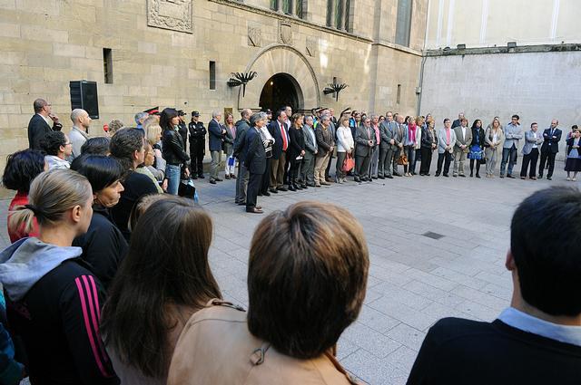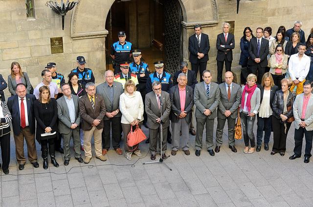 Representants de les diferents institucions i entitats de Lleida i dels cossos de seguretat han participat avui en el minut de silenci celebrat a la plaça de la Paeria.