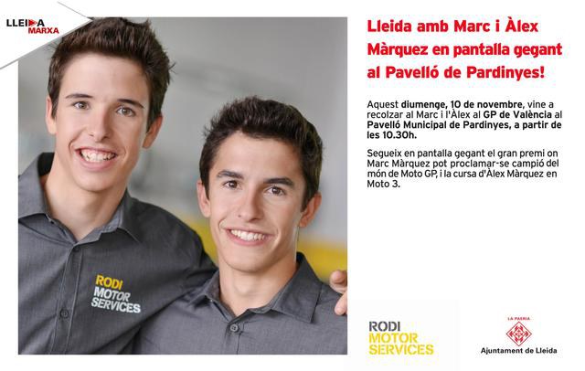 Lleida es prepara per viure en directe el Gran Premi de Moto GP de València on el pilot lleidatà Marc Màrquez pot proclamar-se Campió del món de la categoria. L’Ajuntament de Lleida, conjuntament amb l’empresa RODI MOTOR SERVICES- l’empresa lleidatana patrocinadora dels pilots Àlex i Marc Màrquez- col·loca aquest diumenge una pantalla gegant al Pavelló de Pardinyes que permetrà seguir en directe les curses d’ Àlex i Marc Màrquez al Gran Premi de Moto GP al Circuit Ricardo Tormo de València .
