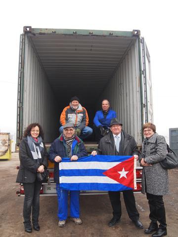La regidora de Drets Civils, Cooperació i Igualtat, M. Rosa Ball, el regidor de Medi Ambient, Josep Barberà, i el president de l’Associació Casal Amics de Cuba, Lluís Companys, han presidit avui l’acte de cessió de 400 contenidors de residus sòlids en desús a l’entitat Amics de Cuba de Lleida, que seran enviats a la província d’Havana Campo (Cuba).