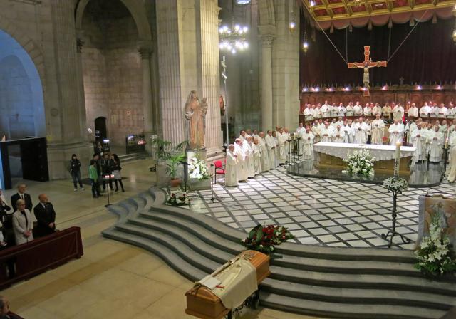 La cerimònia, que ha aplegat centenars de fidels a la Catedral, ha començat amb el trasllat de les despulles de la capella del Santíssim, on els lleidatans li han pogut retre el seu darrer homenatge des de divendres. El fèretre s’ha dipositat al peu del presbiteri, havent-hi dipositat a sobre l’estola, la casulla i el bàcul, símbol d’haver estat pastor de la diòcesi. En acabar l’eucaristia, s’ha aspergit aigua beneïda i encens sobre el cos del bisbe emèrit per, després de llegir un breu testimoni de la seva vida cristiana i ministerial, dipositar el fèretre en el sepulcre a la capella de la Mare de Déu de Montserrat.