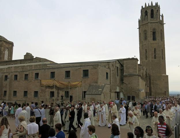 La Seu Vella ha aplegat aquesta tarda centenars de fidels amb motiu de la Diada de Corpus. El paer en cap, Àngel Ros, acompanyat de diversos regidors, ha assistit a la missa, que ha oficiat el bisbe de Lleida, Joan Piris. A aquesta celebració litúrgica hi han assistit els nens i les nenes de les diferents parròquies de Lleida que enguany han rebut la primera comunió, als quals s’ha lliurat una creu per commemorar aquest dia. Després de la missa, a la nau central de la Seu, s’ha fet la processó presidida per la Santa Custòdia. El seguici, amb les autoritats eclesiàstiques i locals i els fidels, ha recorregut l’exterior del monument i ha acabat amb la benedicció del bisbe a tots els presents, amb el Santíssim.