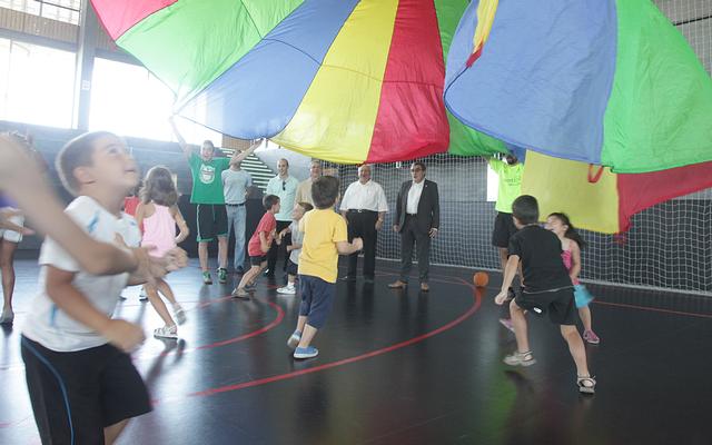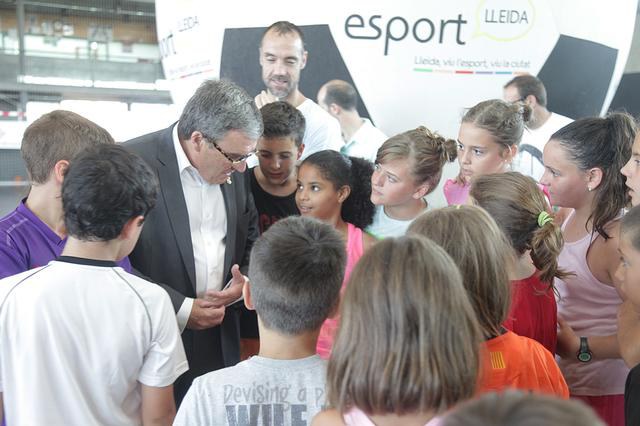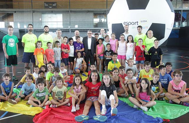L’alcalde de Lleida, Àngel Ros, acompanyat del regidor d’Esports, Txema Alonso, del regidor del Barri de Balàfia, Joan Gómez, del President de l’AAVV del Secà, Julian Garrido, i d’un representant de l’AAVV de Balàfia, ha compartit aquest matí una estona de joc amb els nens i nenes que participen aquest juliol a les estades poliesportives del pavelló Juanjo Garra en el marc de les activitats d’Esportmania, un programa educatiu que compta amb una llarga tradició a Lleida, ja que s’organitza des de fa 34 anys amb èxit de participació any rera any.