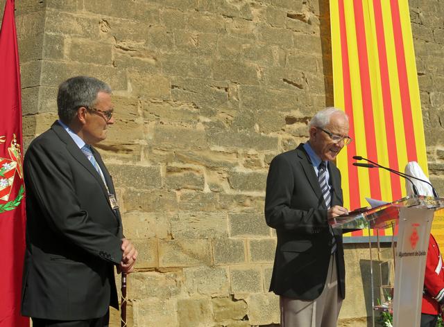El turó de la Seu Vella ha acollit un any més els actes de celebració de la Diada Nacional de Catalunya a Lleida. El paer en cap, Àngel Ros, ha presidit l’acte institucional que s’ha fet davant el pont llevadís, amb la presència dels membres de la Corporació Municipal; els representants de la societat lleidatana i els lleidatans que s’han sumat a la commemoració. Ros ha fet l’ofrena floral amb el catedràtic i historiador Manel Lladonosa, qui ha estat el pregoner d’enguany.
