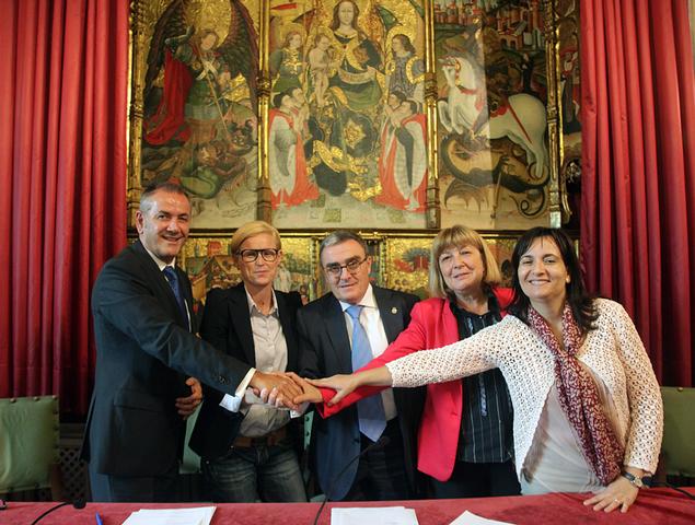 L’Ajuntament de Lleida ha signat avui un conveni amb la Fundació Mapfre per impulsar l’educació viària entre els nens i nenes de Lleida i donar suport al Parc Infantil de Trànsit de Lleida i, un altre, per al foment de la inserció laboral de noies i noies de Down Lleida. L’alcalde de Lleida, Àngel Ros, ha presidit la signatura d’ambdós convenis acompanyat de la tinenta d’alcalde i regidora de Benestar Social, Montse Mínguez, la tinenta d’alcalde i regidora de Seguretat Ciutadana, Sara Mestres, el director general Mapfre Catalunya, Ferran Martínez, i la presidenta de Down Lleida, Pilar Sanjuan.