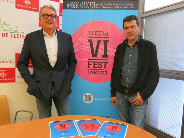 La Festa del Vi de Lleida tornarà a organitzar-se a la plaça de la Llotja en la sisena edició de tardor i ho farà amb més empreses participants i una tarda més. El tinent d’alcalde i regidor de Turisme, Fèlix Larrosa, ha presentat amb el president de la Ruta del Vi de Lleida, Tomàs Cusiné, els detalls de la Lleida VI Fest Tardor, que se celebrarà els dies 25 i 26 d’octubre. Larrosa ha comentat que la festa ha incrementat a 25 el nombre d’empreses participants, vinculades al vi i a la gastronomia, i que inclourà també el diumenge a la tarda. Així, començarà dissabte a la tarda (18 h) i s’allargarà fins diumenge a la tarda (20 h). El tinent d’alcalde ha explicat que l’edició de tardor de la festa del vi és més clàssica i amb més presència familiar i que l’edició de primavera, celebrada al Mercat del Pla, té un perfil més innovador i alternatiu. Durant aquests dos dies, l’oferta enogastronòmica es completarà amb activitats lúdiques, que acompanyaran les degustacions de vins i gastronòmiques, amb música i espectacles. A més, els assistents podran agafar fruita de la campanya de promoció que Turisme de Lleida està fent amb JARC, així com també rebran una xapa i un adhesiu de la Ruta.