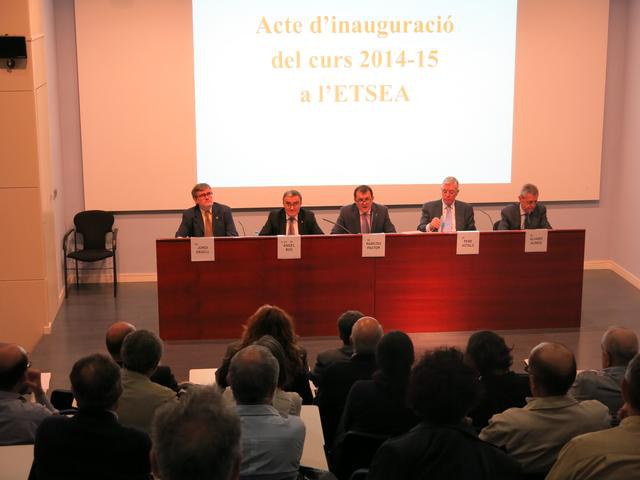 L’alcalde de Lleida, Àngel Ros, juntament amb el director de l’ETSEA, Narciso Pastor, el sotsdirector de l’escola, Jordi Graell, i el secretari acadèmica, Álvaro Aunós, han presidit aquesta tarda la inauguració del curs acadèmic 2014-2015 de l’Escola Tècnica Superior d’Enginyeria Agrària (ETSEA) de la Universitat de Lleida, un acte que en aquesta edició ha comptat també amb la presència de Pere Astals, enginyer agrònom i President de la Federación de Industrias de Alimentación y Bebidas (FIAB), qui ha pronunciat la conferència “Alimentamos el futuro: una estrategia para el sector”.