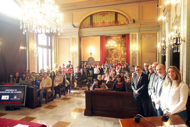 L’alcalde de Lleida, Àngel Ros, juntament amb el regidor de Medi Ambient i Horta, Josep Barberà, i el regidor d’Educació i Infància de l’Ajuntament de Lleida, Jesús Castillo, ha presidit avui la signatura del compromís dels centres educatius amb l’Agenda 21 Escolar, un acte que ha tingut lloc en un Saló de Sessions ple de gom a gom. Un total de 72 centres educatius de Lleida participen enguany en l’Agenda 21 Escolar, un programa educatiu que té per objectiu implicar les escoles i els infants a favor d’un món més sostenible a través de projectes relacionats amb el Medi Ambient.