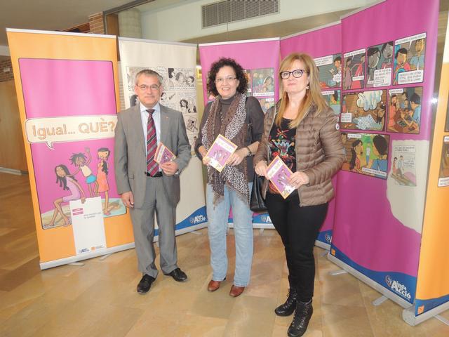 La regidora de Drets Civils, Cooperació i Igualtat, M. Rosa Ball, el regidor de Balàfia, Joan Gómez, i la presidenta de l’ONG Ajuda en Acció a Lleida, Lourdes Montalà, han visitat avui l’exposició "Igual què?" d’Ajuda en Acció, ubicada al Centre Cívic de Balàfia.
