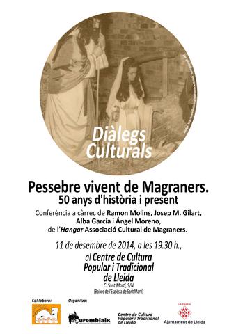 El Centre de Cultura Popular i Tradicional –ubicat als baixos de l’església de Sant Martí- acull, demà dijous a les 19.30 hores, una nova sessió dels Diàlegs Culturals, dedicada en aquesta ocasió a la història del pessebre vivent de Magraners.