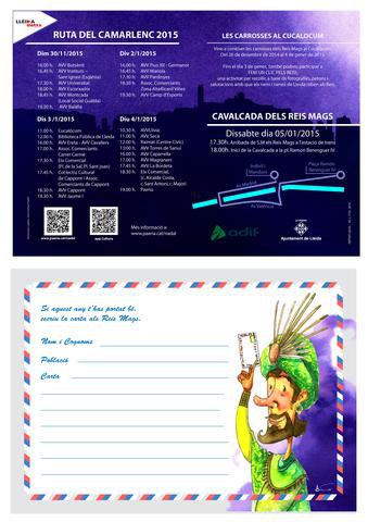 El Gran Camarlenc ha arribat avui a Lleida amb l’encàrrec reial de recollir les cartes que els nens i les nenes de la ciutat volen fer arribar a Ses Majestats els Reis d’Orient. Al llarg de quatre dies recorrerà la geografia de la nostra ciutat, renovant la il·lusió i la màgia de les festes nadalenques. Per col·laborar en la tasca del Camarlenc, l’Ajuntament de Lleida ha editat una postal que s’ha distribuït en diversos espais públics, com la Paeria, Cultura, Turisme, el Cucalòcum, etcètera, amb l’objectiu de donar a conèixer l’itinerari i els horaris de l’emissari reial. La Postal, a banda de la informació, inclou un espai on els nens i nenes poden escriure les seves peticions als Reis d’Orient.