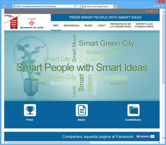 L’Ajuntament de Lleida ha obert el termini de presentació i recolzament de candidatures del premi “Smart People with Smart Ideas” a través del servei web www.paeria.es/premismart. La presentació de les candidatures és lliure i oberta i es basa en l’ús de la xarxa i en el que s’anomena “crowdproposal”, propostes fetes, sostingudes i seleccionades per les persones i entitats a través de la pròpia xarxa.