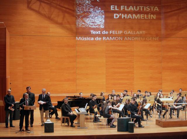 L’alcalde de Lleida, Àngel Ros, i el regidor d’Educació i Infància de la Paeria, Jesús Castillo, han saludat aquesta tarda els joves participants en la representació de la cantata escènica “El flautista d’Hamelin”, una adaptació realitzada per Felip Gallart del conte dels germans Grimm amb música de Ramon Andreu Gené, dirigida per Robert Faltus. El paer en cap ha destacat la importància de l’educació artística, fonamental en l’educació integral dels nois i noies, ha felicitat els alumnes i escoles participants i els ha recordat que a Lleida la música ha generat històricament grans músics com Ricard Viñes o Enric Granados- del qual al 2016 se celebra el centenari de la seva mort- i també actualment “tenim exemples de lleidatans músics directors i compositors reconeguts arreu com Joan Pagès, Pedro Pardo o Néstor Bayona, premiat recentment amb el Premi Internacional Ciutat de Lleida”.