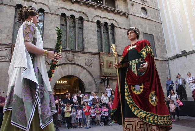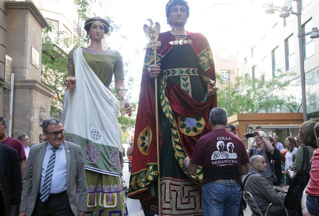 Els Gegants romans han arribat a la plaça Bores, des d'on s'ha iniciat una cercavila que ha recorregut el Pont Vell, l’Arc del Pont, la Plaça Paeria, el Carrer Major, el Pati de les Comèdies i el Carrer Cavallers.