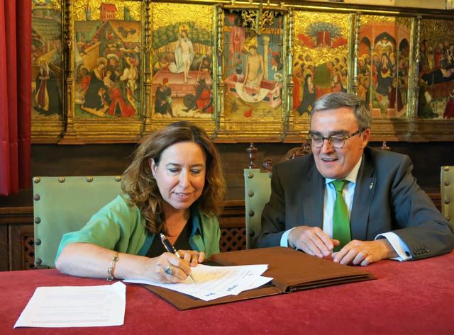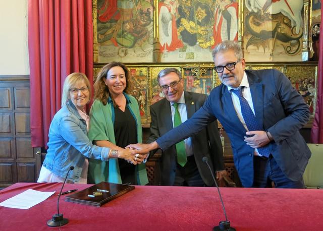 La tinent d’alcalde i regidora de Cultura, Montse Parra, i el conseller delegat de la Fundació Sorigué, Sebastià Espinet, també han estat presents en l’acte de la signatura del conveni, al Saló del Retaule de la Paeria.