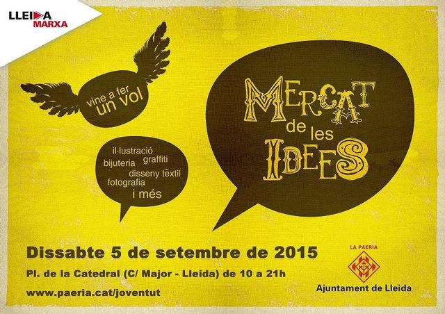 El 8è Mercat de les Idees, organitzat per la Regidoria de Joventut de l’Ajuntament de Lleida, tindrà lloc el demà 5 de setembre al carrer Major, a l’altura de la Catedral. Al Mercat, hi trobarem bijuteria, joieria, pintura, escultura, complements, roba, scrapbooking i disseny gràfic.