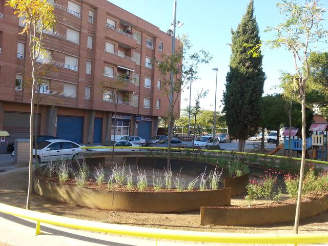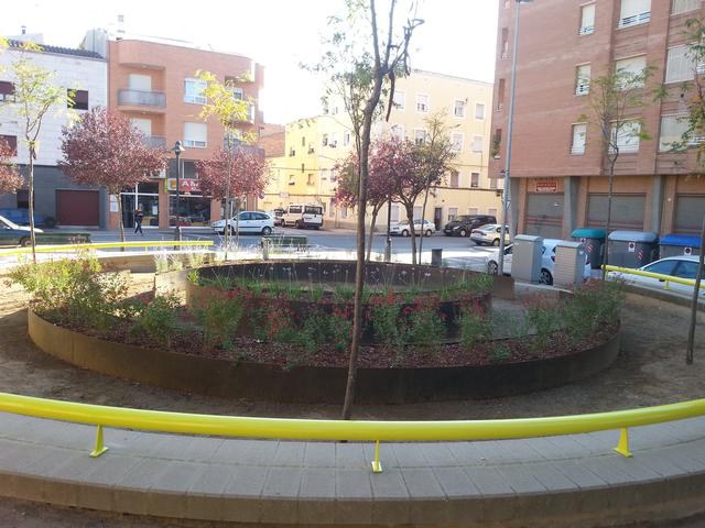 L’enjardinament de tota la zona ha consistit en la plantació de prop d’una desena d’arbres i la col·locació de tres jardineres amb arbustiva. A més a més, s’ha arranjat aquest l’espai públic amb sauló. Cal destacar que les 200 plantes arbustives col·locades en aquest nou espai públic s’han produït, per primera vegada, a la nova brigada de jardineria del Parc de l’Aigua.