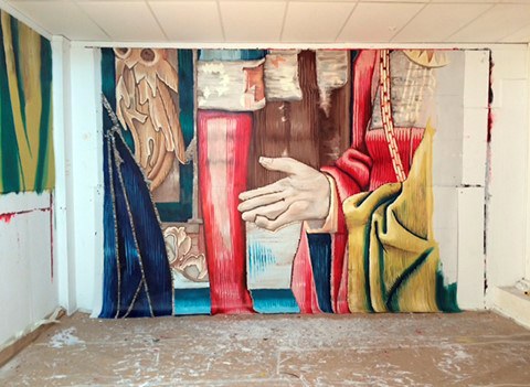 El procés d’elaboració del mural és complex, ja que al taller ha disposat 31 peces de tela per poder pintar el mural que té una mida de 140 metres quadrats. Després de pintar una maqueta per escollir la paleta de colors i la tècnica de pintura, l’artista ha preparat les teles i les pinta sistemàticament i en ordre per tal que el mural quedi com una sola peça un cop col·locat a la paret. Traslladarà les peces enrotllades a Lleida, on les instal·larà el proper mes de març.