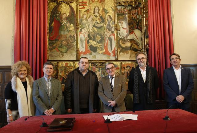 L’alcalde de Lleida, Àngel Ros, acompanyat pel tinent d’alcalde i regidor de Polítiques per als Drets de les Persones, Dr. Xavier Rodamilans, i pel representant de Salesians Sant Jordi, Joan Valls, han presidit avui la signatura d’un conveni de cessió dels espais dels Centres Oberts El Mercat i Trampolí als Salesians Sant Jordi, uns espais destinats a atendre a adolescents i joves en risc de vulnerabilitat.