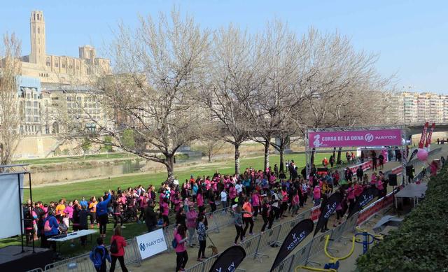 La Cursa de la Dona Nayox ha omplert un any més els carrers de Lleida de participants que han volgut solidaritzar-se amb la lluita contra el càncer de mama. La tinent d’alcalde i regidora d’Esports, Montse Parra, ha estat encarregada de donar el tret de sortida a les 1.300 participants que s’han donat cita a la canalització del Segre per recórrer un dels dos circuits previstos, el curt de 5,6 quilòmetres, o el llarg, d’11,2, ja que es doblava el marcat inicialment.