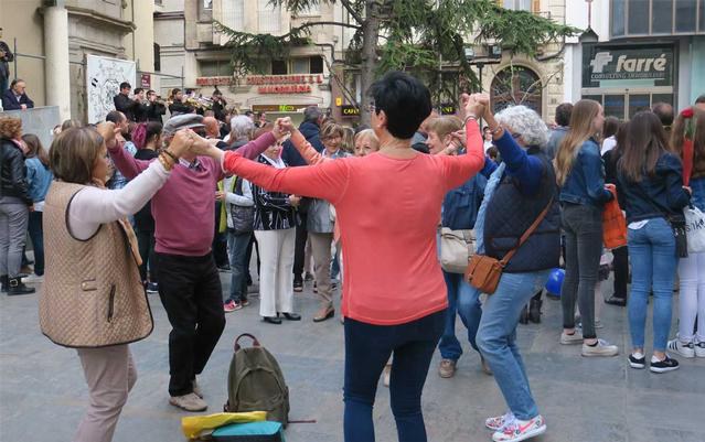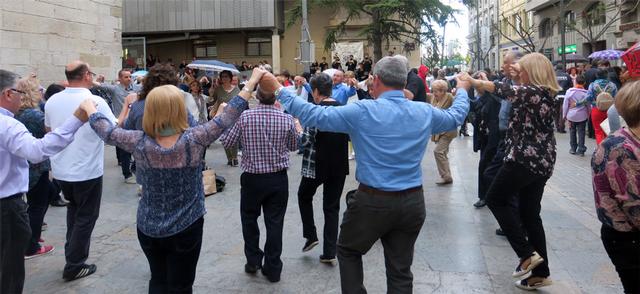 Una altra plaça de l’Eix Comercial, el Pati de les Comèdies, ha estat escenari de la ballada de sardanes, a càrrec de la cobla Jovenívola d’Agramunt. Malgrat les quatre gotes del final de la tarda, els ciutadans, animats com estaven, han continuat dansant amb les seves rotllanes.