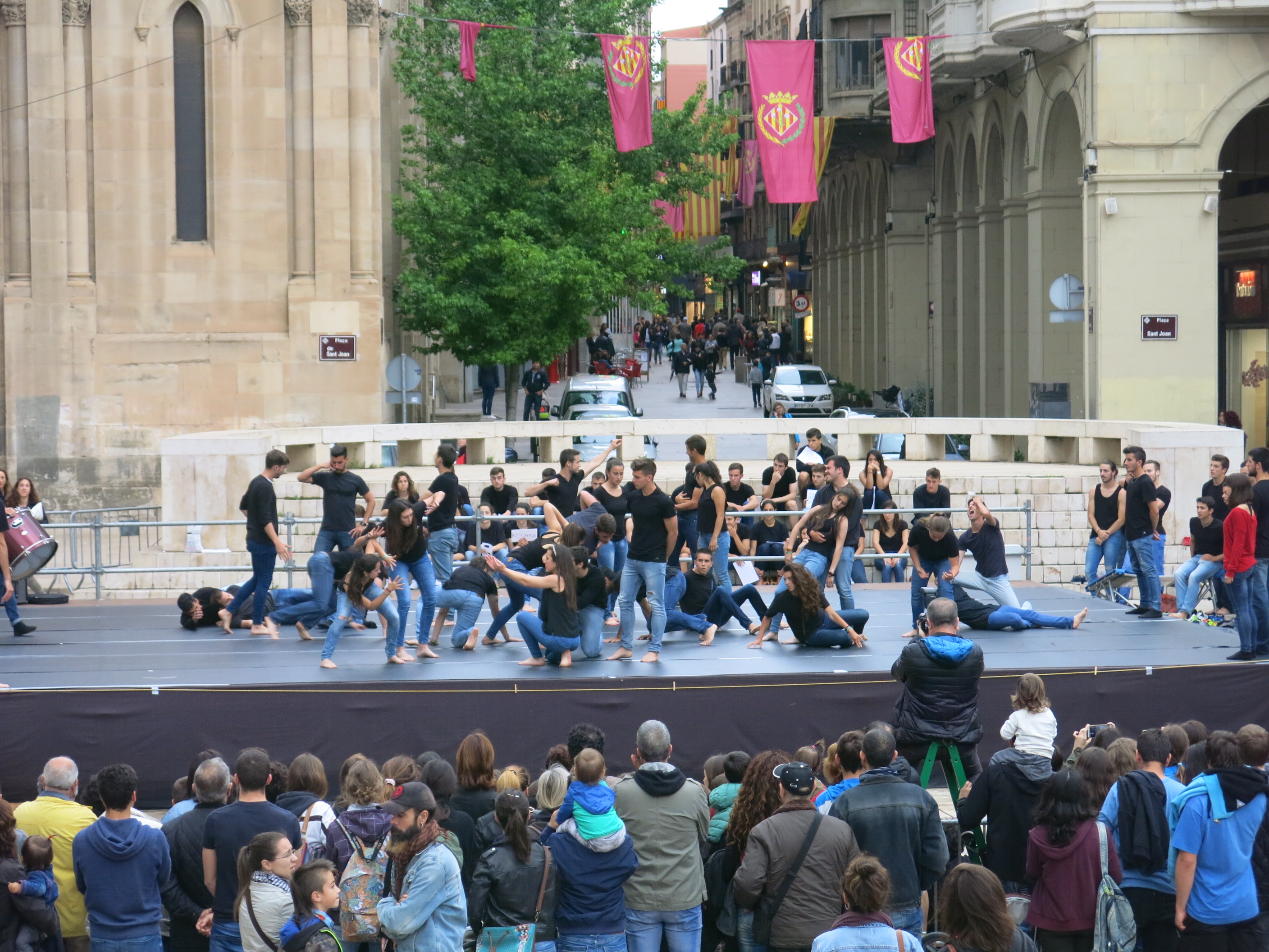 Centenars de persones s’han aplegat aquesta tarda a la Plaça Sant Joan de Lleida per gaudir d’un variat repertori de ball i de gimnàstica acrobàtica amb l’espectacle Flip-Flop, a càrrec dels Club INEFC Lleida i Barcelona, que s’ha celebrat amb motiu de la Festa Major de Maig. La tinenta d’alcalde i regidora de Polítiques a Favor de la Creativitat, la Cultura, l’Educació i els Esports, Montse Parra, ha assistit a l’actuació, que ha ofert una representació a favor dels refugiats que arriben arreu d’Europa.