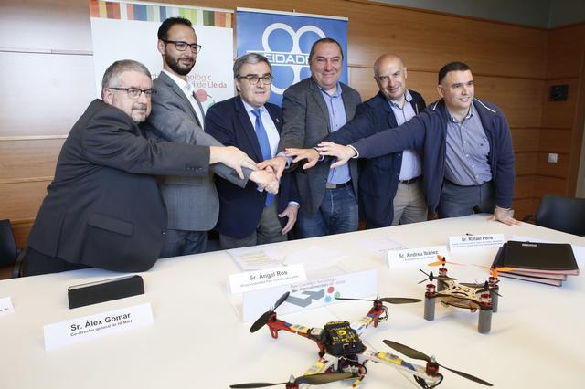 El Parc Científic de Lleida acull un dels clústers de drones més potent del territori català i estatal. Així ha quedat palès en la signatura del convenci de col·laboració que s’ha fet aquest matí entre el Parc Científic i Tecnològic de Lleida, l’operadora de drons High Endurance Multipurpuse Aerial Vehicles (HEMAV) i l’associació Lleida Drone. El vicepresident del Parc i paer en cap, Àngel Ros, acompanyat del tinent d’alcalde Rafael Peris, ha presidit la signatura del document que té com a objectiu potenciar la formació, ja sigui entre universitaris o estudiants de cicles formatius, estimular la recerca i fomentar l’esperit emprenedor en el sector dels Drones vinculat a les noves tecnologies. A la signatura, hi ha estat presents el vicerector de Política Científica i Tecnològica de la Universitat de Lleida, Albert Sorribas; el codirector general d’HEMAV, Àlex Gomar; el president de Lleida Drone, Andreu Ibáñez; el secretari de l’entitat, Jordi Lordán, i el gerent del Parc, Josep Clotet.