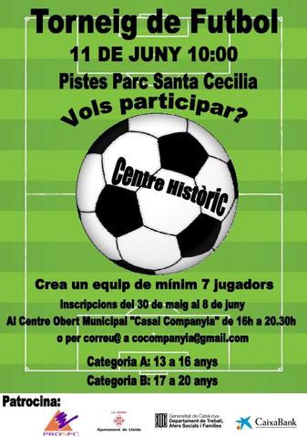 El grup de Joves del Centre Obert Municipal Companyia organitza un torneig de futbol al Centre Històric, que es disputarà aquest dissabte, 11 de juny, a la pista del Parc de Santa Cecília, a les 10 h. El torneig està dirigit als adolescents i els joves del barri i s’emmarca en el conjunt d’iniciatives que pretenen promoure i fomentar activitats al Centre Històric. Es disputarà en dues categories: la A, amb participants de 13 a 16 anys, i la B, de 17 a 20 anys. Els equips han de ser de 7 jugadors.