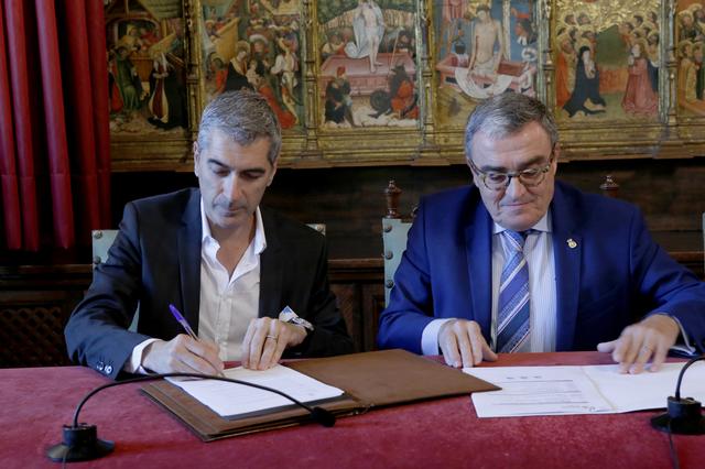 L’alcalde de Lleida, Àngel Ros, acompanyat de la tinenta d’alcalde i regidora de Polítiques a Favor de la Creativitat, la Cultura, l’Educació i els Esports, Montse Parra, ha presidit avui la signatura del conveni de col·laboració entre la Paeria i l’empresa Clos Pons, mitjançant el qual s’impulsa la unió entre la cultura i vi de proximitat en els esdeveniments culturals de la ciutat.