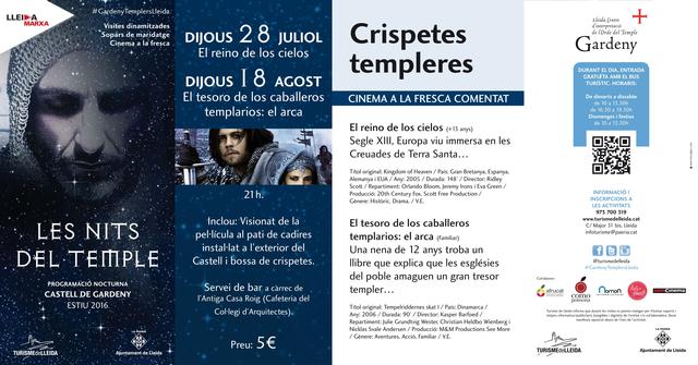 Turisme de Lleida de la Paeria ha programat per aquest dijous una sessió de cinema a la fresca al Castell de Gardeny, dins el programa Les Nits del Temple. L’activitat “Crispetes Templeres” ofereix la projecció de la pel·lícula de temàtica templera “El Reino de los cielos”, al pati del Castell, a les 21 h. El preu de l’entrada és de 5 euros i inclou el visionat del film i una bossa de crispetes.