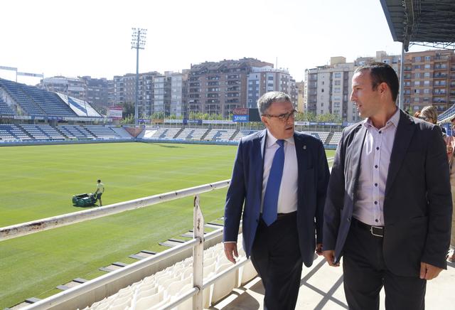 El Lleida Esportiu estrenarà aquest vespre la nova gespa, els nous sistemes de reg i de drenatge, banquetes i porteries, en el partit contra L’Hospitalet. L’alcalde Ros ha visitat els últims treballs de l’actuació, que ha permès també ampliar les dimensions del terreny de joc