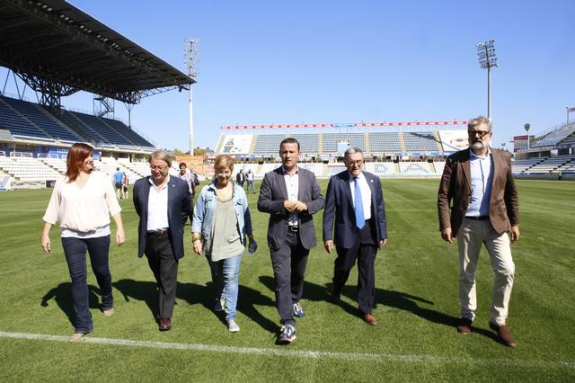 Els regidors Paco Cerdà i Dolors López han estat també en la visita, en què s’ha baixat al terreny de joc per veure com les màquines i els treballadors acabaven de posar a punt la nova gespa per aquest vespre. El projecte es va adjudicar a l’empresa de jardineria professional i especialitzada en zones esportives Royalverd.