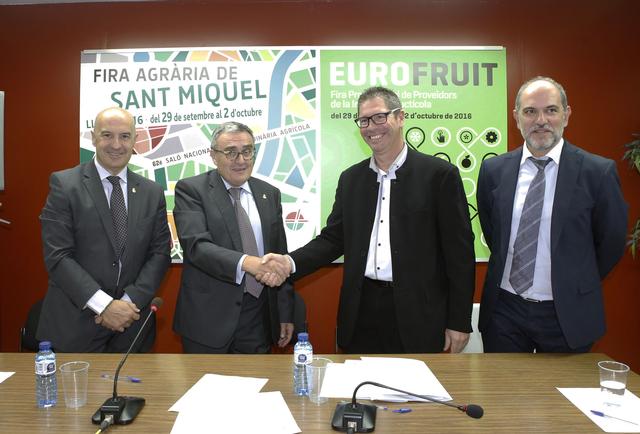 L’alcalde de Lleida i president del Patronat de la Fundació Fira de Lleida, Àngel Ros, i Cédric Abadia, director del Salon de l’Agricultura de Tarbes, han signat aquesta tarda en el marc de la Fira de Sant Miquel i Eurofruit un acord de col·laboració destinat a reforçar la col·laboració entre les dues institucions firals, i més genèricament, entre els territoris català i francès.