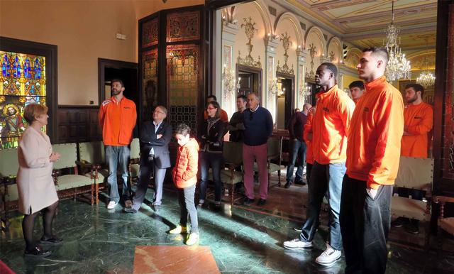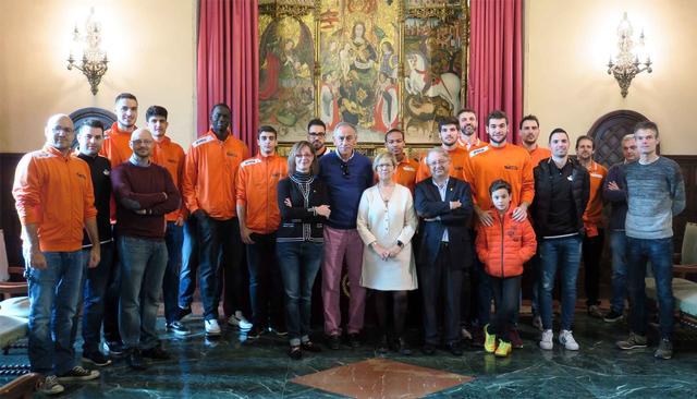 La tinent d’alcalde Montse Parra rep els jugadors i tècnics del primer equip de bàsquet de la ciutat, acompanyats per una representació de la junta directiva