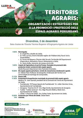 “Territoris agraris: organització i estratègies per a la promoció i protecció dels espais periurbans” se celebrarà divendres 2 de desembre a l’Escola Tècnica Superior d’Enginyeria Agrària de la UdL en la qual s’explicaran experiències i exemples de promoció i protecció de les zones agràries suburbanes, com és el cas de l’Horta de Lleida El Pla Operatiu de l'Horta presentat pel Govern Municipal preveu aquest tipus de jornades de divulgació, participatives i de debat