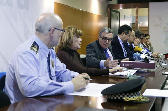 L’alcalde de Lleida, Àngel Ros, juntament amb el delegat del Govern de la Generalitat a Lleida, Ramon Farré, ha presidit avui la presentació de la Campanya de Trànsit i Seguretat Ciutadana que es realitza cada any amb motiu de les Festes de Nadal, juntament amb la regidora de Seguretat Ciutadana, Sara Mestres, així com els representants dels cossos de Guàrdia Urbana i Mossos d'Esquadra.