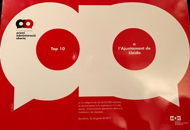 L’Ajuntament de Lleida ha rebut aquesta tarda el guardó “Top 10” que atorga el Consorci Adminsitració Oberta de Catalunya en reconeixement a la implantació i l’ús dels serveis d’administració electrònica oferts a la ciutadania i a les empreses.