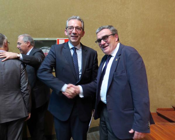 L’alcalde de Lleida, Àngel Ros, assisteix a l’acte de presa de possessió, felicita al president electe i agraeix al sortint, Ramon Roca, l’excel·lent tasca desenvolupada durant aquests darrers vuit anys