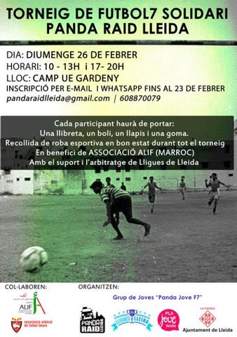 El torneig solidari “Panda Raid Lleida” de futbol 7 recollirà material escolar i esportiu per donar-lo a una escola ubicada a la ciutat de Larache, al Marroc. El grup de joves Panda Jove Fut7, l’ONG Panda Raid Lleida, Lligues Lleida i el departament de Joventut de la Paeria han organitzat l’activitat en benefici de l’Associació Alif. El torneig es jugarà el diumenge 26 de febrer, matí i tarda -de 10 h a 12 h i de 17 h a 20 h- al camp municipal de la UE Gardeny.
