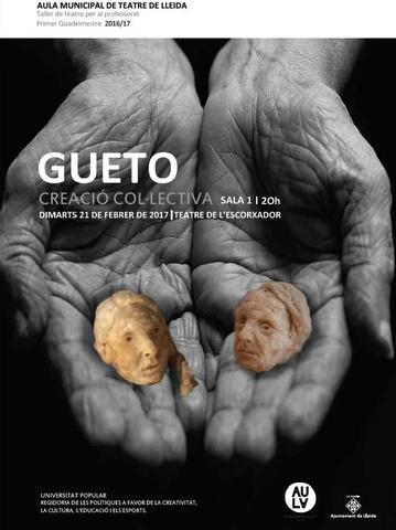 La sala 1 del Teatre de l'Escorxador va acollir aquest dimarts al vespre la representació del taller de creació col·lectiva ‘Gueto’, que ha posat el punt i final al taller de teatre per al professorat de la Universitat Popular que organitza el servei d'Educació de l'Ajuntament de Lleida. la direcció artística d'aquesta activitat, en què ha participat una quinzena de professors i professores, ha anat a càrrec de Jaume Belló, professor d'interpretació de l'Aula Municipal de Teatre.