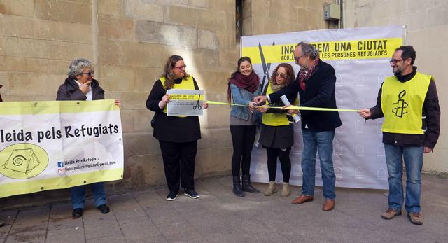 El tinent d’alcalde i regidor de Polítiques per als Drets de les Persones, Xavier Rodamilans, i els representants del Grup Amnistia Lleida han tallat una cinta groga per simbolitzar la inauguració de Lleida com a ciutat acollidora.