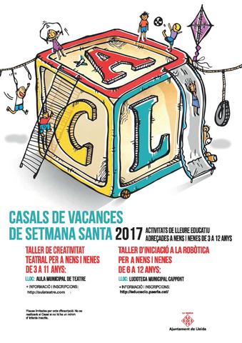 L’Ajuntament de Lleida obre aquest dilluns el termini per fer les inscripcions per als casals de vacances de Setmana Santa. El Servei d’Educació municipal ofereix aquesta proposta educativa i de lleure perquè les famílies puguin conciliar la vida familiar i laboral, alhora que els nens i les nenes gaudeixin d’un espai educatiu en el temps de lleure de les vacances escolars. Aquest any s’ofereix el Taller de Creativitat Teatral, que està dirigit a nens i nenes de 3 a 11 anys, i el Taller de Robòtica, que està dirigit a nens i nenes d’entre 6 i 12 anys.