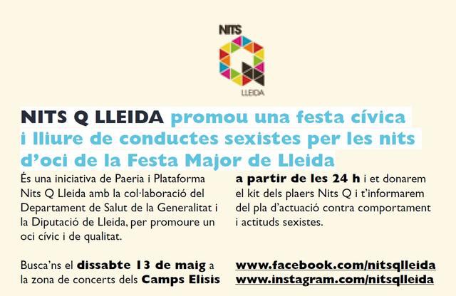 Nits Q estarà present a la Festa Major de Maig un any més per promoure una festa saludable, cívica i responsable. D’una banda, el programa d’actes de les festes inclou un decàleg de recomanacions Nits Q per poder gaudir de la festa d’una manera cívica i respectuosa amb tothom. D’altra banda, el dissabte 13 de maig hi haurà un punt informatiu a la revetlla dels Camps Elisis (a partir de les 23 h) amb l’equip de joves voluntaris Nits Q Lleida que repartiran el Kit dels plaers amb informació preventiva i de reducció de riscos durant la nit. La campanya incorpora també el missatge “Lleida, lliure d’actituds sexistes i discriminatòries” per sensibilitzar la població envers les conductes sexistes i discriminatòries que es donen en els entorns d’oci. L’objectiu final és aconseguir espais d’oci inclusius en els quals tothom es senti lliure i segur per gaudir de la festa.